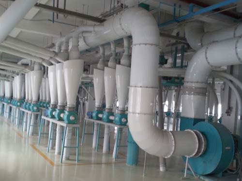 500噸面粉加工成套設備,該工藝以小麥為原料,日處理小麥500噸,是一條自動生產(chǎn)線,清理、去石、打麥、除塵、著水、凈糧二次清理、輸送等工段。